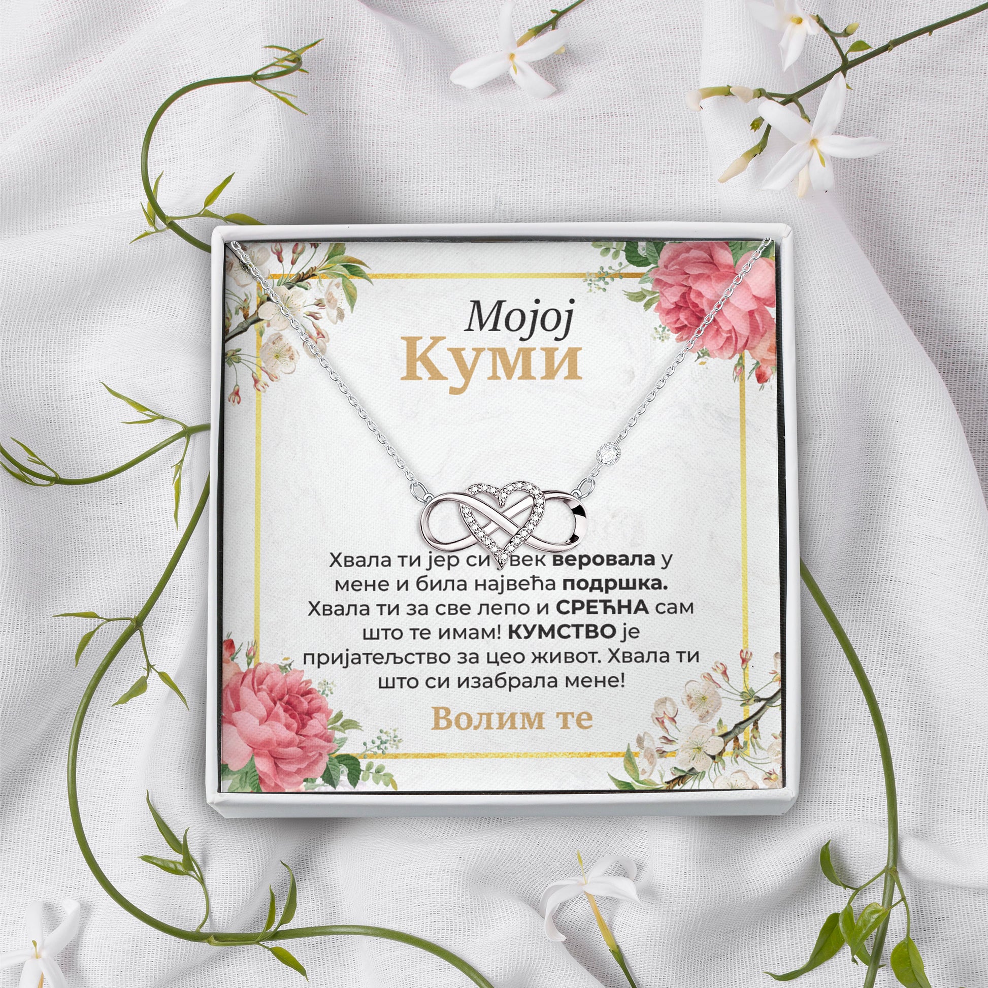 Oduševite svoju kumu jedinstvenim poklonom koji nosi trajnu poruku ljubavi – ogrlica od nerđajućeg čelika, pozlaćena sa 14K belim zlatom.